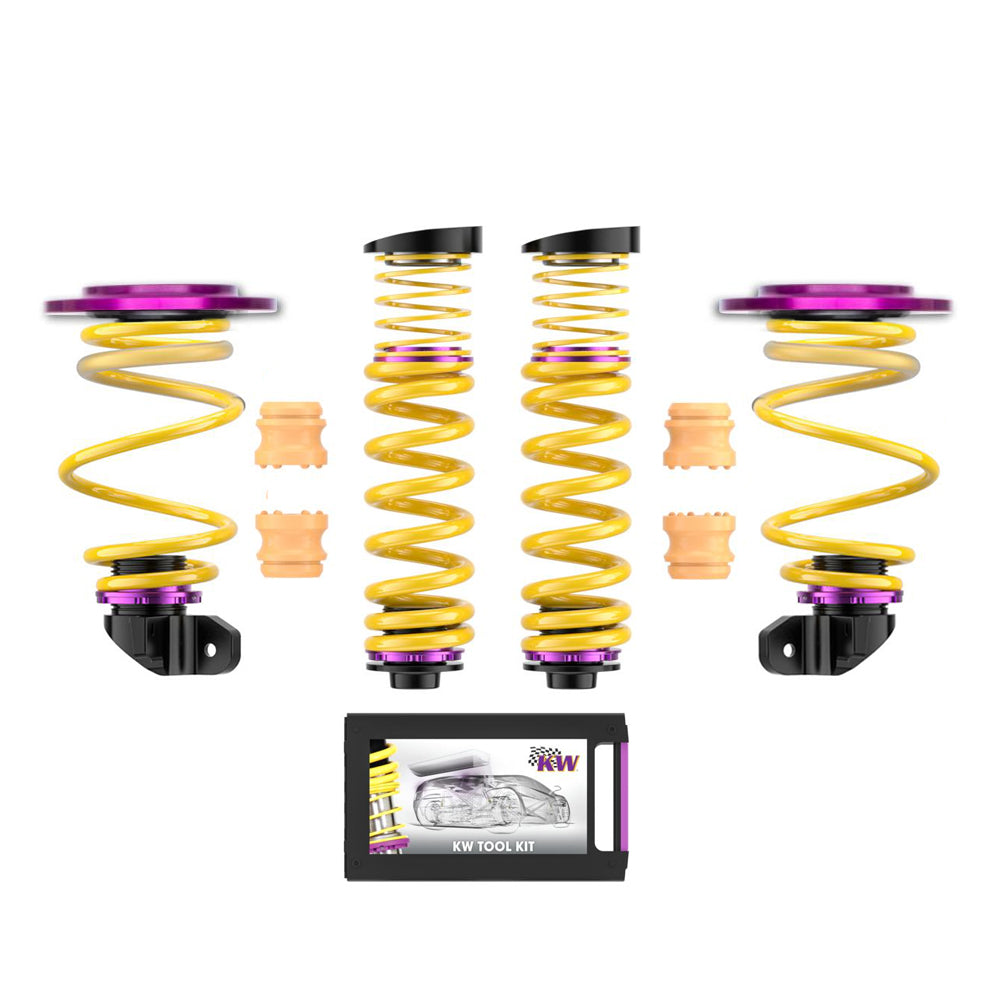 Our spring kit is created with parts available from our partners KW Automotive. The kit features motorsport derived front springs + tender spring combination which allows the dampers to be used to their maximum potential. Due to the tender spring combination front axle roll is controlled and turn-in stiffness is greatly increased allowing for a quicker, more responsive front end, less dynamic roll when cornering and better mid-corner response from the front axle.